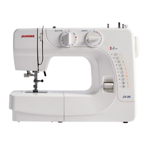 The Janome J3-20 operates as a mechanical sewing machine with a simple 2-dial control system. Users select stitches through the stitch selector dial and adjust settings with the second dial.